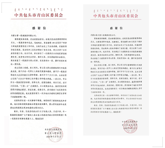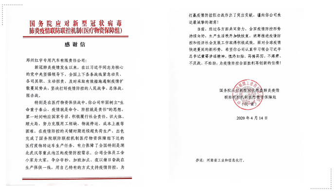 近日,中國兵器工業(yè)集團豫西集團鄭州紅宇專汽公司、一機集團和北重集團分別收到國務(wù)院應(yīng)對新型冠狀病毒肺炎疫情聯(lián)防聯(lián)控機制醫(yī)療物資保障組,包頭市青山區(qū)委、區(qū)政府發(fā)來的感謝信、慰問信,對他們在打贏疫情防控人民戰(zhàn)爭、總體戰(zhàn)、阻擊戰(zhàn)中作出的貢獻表示感謝。 豫西集團鄭州紅宇專汽公司收到國務(wù)院聯(lián)防聯(lián)控機制感謝信 4月14日,國務(wù)院應(yīng)對新型冠狀病毒肺炎疫情聯(lián)防聯(lián)控機制醫(yī)療物資保障組向中國兵器工業(yè)集團豫西集團鄭州紅宇專汽公司發(fā)來感謝信。 豫西集團鄭州紅宇專汽公司收到國務(wù)院應(yīng)對新型冠狀病毒肺炎疫情聯(lián)防聯(lián)控機制醫(yī)療物資保障組發(fā)來的感謝信 信中指出,新冠肺炎疫情發(fā)生以來,在以習(xí)近平同志為核心的黨中央堅強領(lǐng)導(dǎo)下,全國上下各條戰(zhàn)線緊急動員、各司其職、主動擔責(zé),及時采取有效措施遏制疫情擴散蔓延勢頭,堅決打好疫情防控的人民戰(zhàn)爭、總體戰(zhàn)、阻擊戰(zhàn)。 特別是在醫(yī)療物資保供戰(zhàn)中,鄭州紅宇專汽公司牢固樹立“生命重于泰山、疫情就是命令、防控就是責(zé)任”的思想,第一時間響應(yīng)國家號召,積極履行社會責(zé)任,識大體、顧大局,努力克服用工短缺、物流停運、成本上漲等困難,在疫情防控的關(guān)鍵時期連續(xù)超負荷生產(chǎn),出色完成了國務(wù)院聯(lián)防聯(lián)控機制醫(yī)療物資保障組下達的醫(yī)療廢物轉(zhuǎn)運車生產(chǎn)任務(wù),有力保障了全國特別是湖北武漢等重點地區(qū)的疫情防控需求。公司全體員工舍小家為大家、爭分奪秒、加班加點,夜以繼日奮戰(zhàn)在生產(chǎn)保供一線,用自己特有的方式支持疫情防控,為打贏疫情防控阻擊戰(zhàn)作出了突出貢獻。 鄭州紅宇專汽公司緊急生產(chǎn)醫(yī)療廢物轉(zhuǎn)運車并及時發(fā)運 疫情發(fā)生以來,鄭州紅宇專汽公司已簽約醫(yī)療廢物轉(zhuǎn)運車107臺,累計下線90臺,交付83臺。 一機集團和北重集團收到中共包頭市青山區(qū)委員會、青山區(qū)人民政府發(fā)來的感謝信和慰問信 4月13日,中共包頭市青山區(qū)委員會、青山區(qū)人民政府向中國兵器工業(yè)集團一機集團和北重集團發(fā)來感謝信和慰問信,對參與青山區(qū)防控疫情一線工作的一機集團、北重集團黨員干部職工及給予充分理解、全力支持的家屬們,表示衷心的感謝并致以最崇高的敬意!