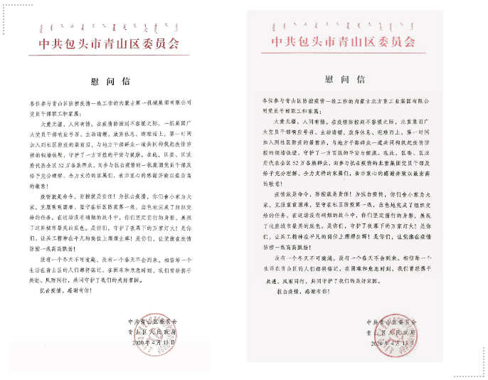 一機集團、北重集團收到中共包頭市青山區(qū)委員會、青山區(qū)人民政府發(fā)來的慰問信 信中指出,在青山區(qū)抗擊疫情最緊要的關(guān)頭,一機集團、北重集團雪中送炭、迅速響應(yīng),分別緊急抽調(diào)百余名黨員干部參與到地區(qū)疫情防控工作中,為全區(qū)上下眾志成城,打贏疫情防控的人民戰(zhàn)爭、總體戰(zhàn)、阻擊戰(zhàn)增添了寶貴力量,有力支持了全區(qū)疫情防控工作,彰顯了一機集團、北重集團在公共危機面前挺膺負責(zé)、挺身而出的社會責(zé)任,胸懷大局、無私奉獻的社會擔當。 一機集團黨員干部馳援青山區(qū)疫情防控一線 北重集團黨員干部馳援青山區(qū)疫情防控一線 來源/豫西集團紅宇專汽公司、一機集團、北重集團